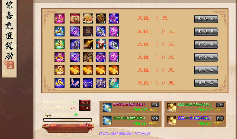 4:本服充值比例1元等于10充值点=50万赠点+2000,门贡所有物品都能在商城购买,无隐藏套路